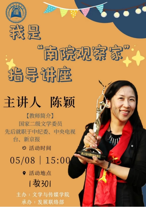 为了给“我是南院观察家”参赛选手、广大新闻爱好者以及希望提升新闻稿写作能力的同学们提供一个学习与交流的平台,“我是南院观察家”推出新闻写作指导讲座。本次讲座的主讲嘉宾是威廉希尔williamhill中文陈颖老师,她将与同学们分享自己多年来的新闻稿写作经验,从选题、构思、撰写到发布,全方位解析新闻稿的写作要点和技巧。