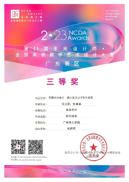 而伍世颖却很少有迷茫的时候。他坚信,与其迷茫,不如抓紧时间行动起来,把自己投入到大量有意义的活动当中。大一时,他目标明确,以做一个专业扎实,品德良好的优秀学生为方向。在学习上,伍世颖热衷于参加竞赛,以赛为练,提高自己的专业能力,通过不同的竞赛磨炼,大一至大二学年累计获得赛事奖项30余项,也收获了自己的第一个设计金奖。随后,他把目标放在更高级别的竞赛当中,积极与其他学院的好友一起组队参赛,在大三学年收获满满。并且他还积极参加各类社团和项目,因此,他不仅是许多部门的学生骨干,他还积极参与学校录取通知书插画、招生手册设计、招生简章设计、学院LOGO等,为学校、院系的发展做出贡献。同时,伍世颖积极参与社会实践,他的身影出现在社区街道、校园实践活动当中,如参与广州江泰路墙绘项目设计、越秀田园综合体设计等。因为热爱,所以选择去做。“一定要保持思考,思考自己未来要成为怎么样的人以及今后的发展方向,并朝着这个方向前进。”