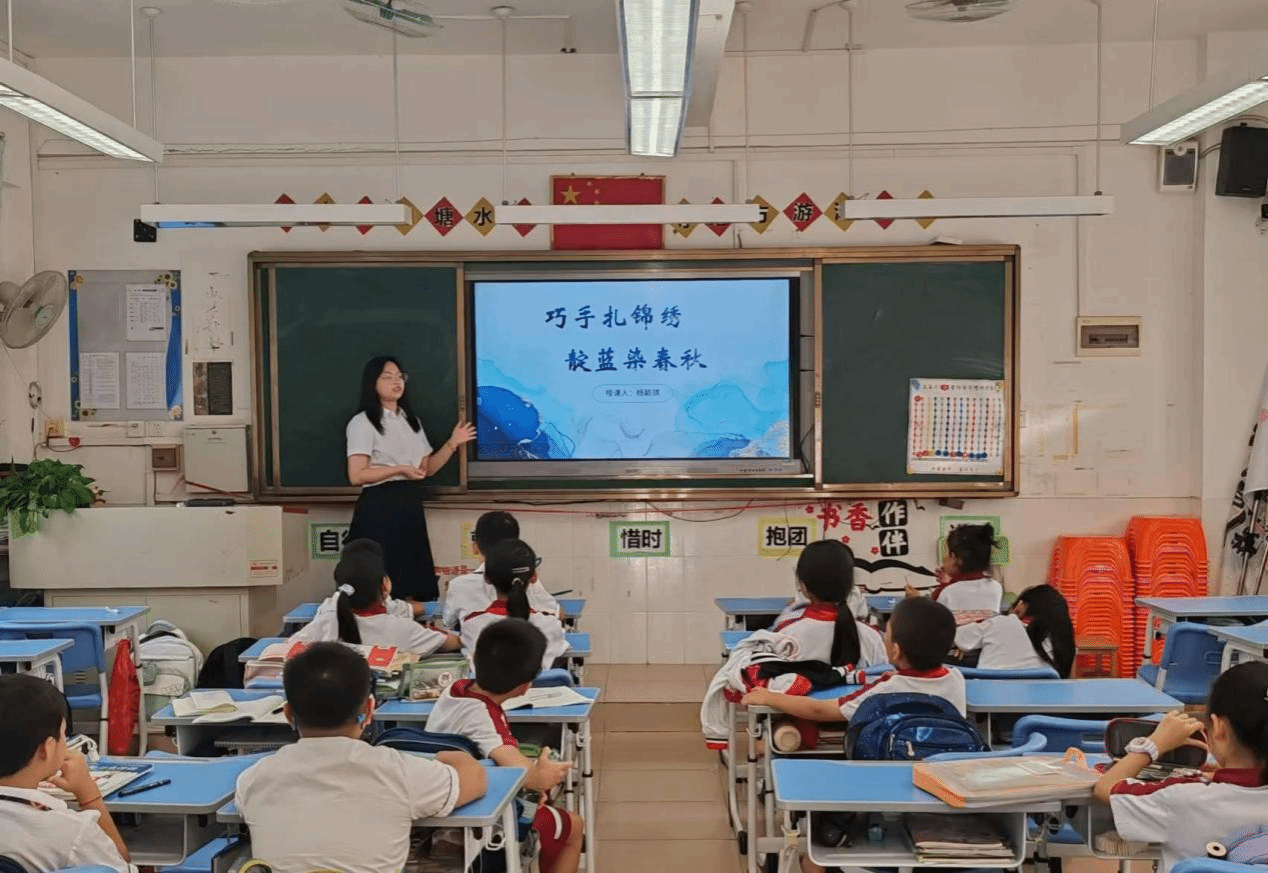 2024年10月23日下午,广州南方学院威廉希尔williamhill中文语言文字服务团队在钟依琼老师带领下,赴从化区流溪小学开展非遗文化传承课堂。本次活动以“扎染技艺”为主题,由2022级汉语言文学专业杨颖琪同学担任主讲,通过历史讲解、艺术赏析与互动教学相结合的方式,为小学生开启了一场传统工艺的色彩探索之旅。