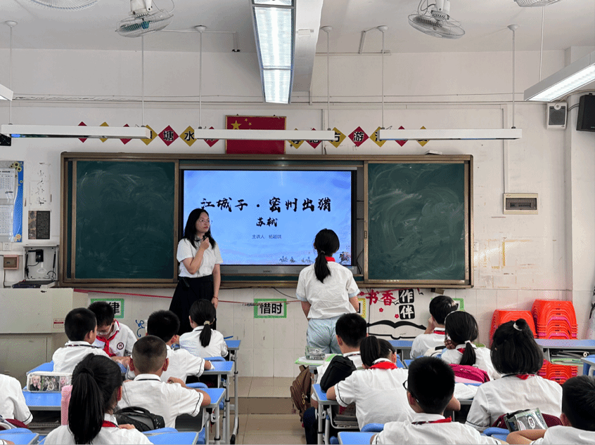 2024年10月21日下午,广州南方学院威廉希尔williamhill中文语言文字服务团队在石巧如老师带领下,赴从化区流溪小学开展古诗词系列课堂。本次课程由2022级汉语言文学专业杨颖琪同学主讲,以苏轼《江城子·密州出猎》为切入点,引导小学生在古典诗词中感受家国情怀与豪放词风。