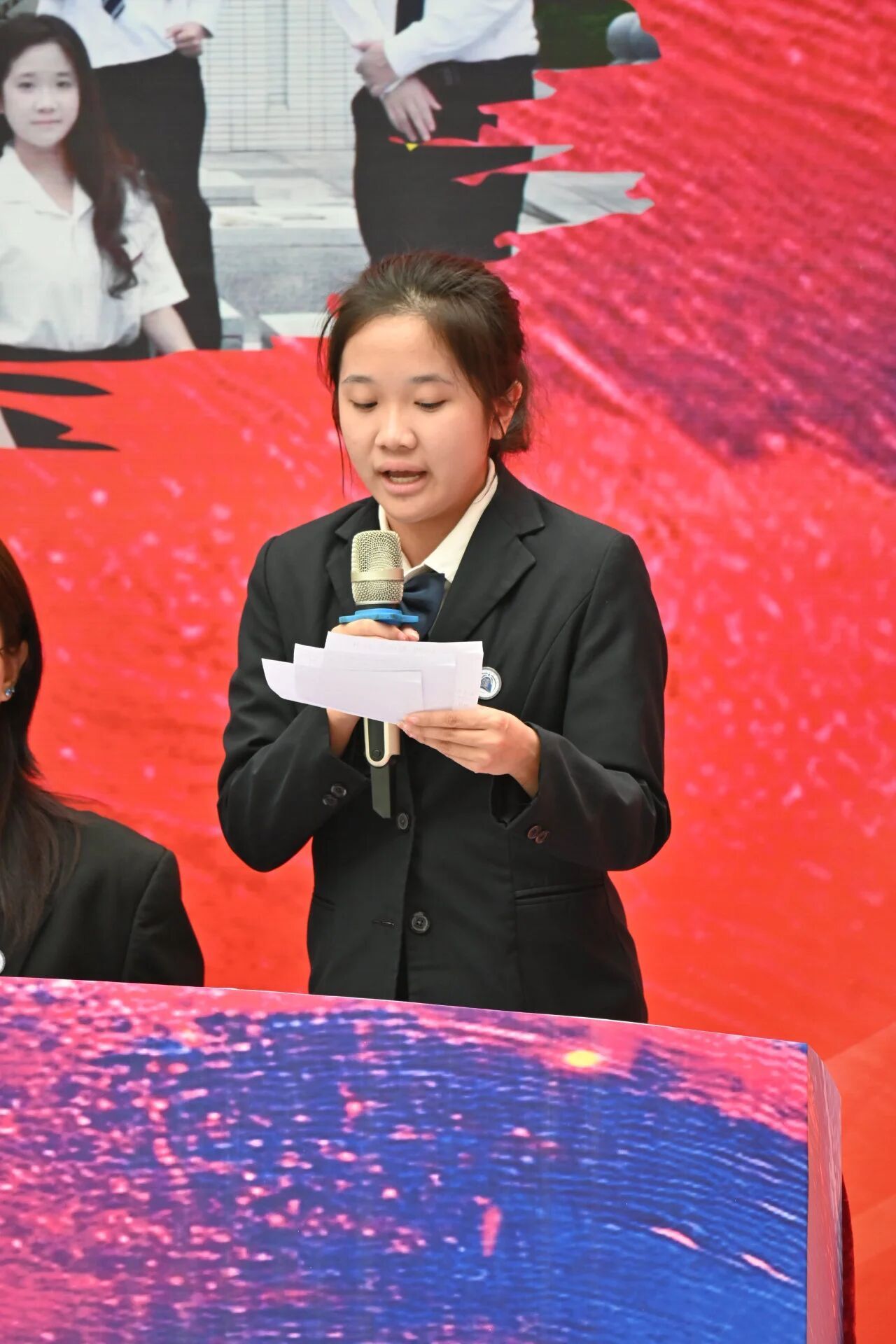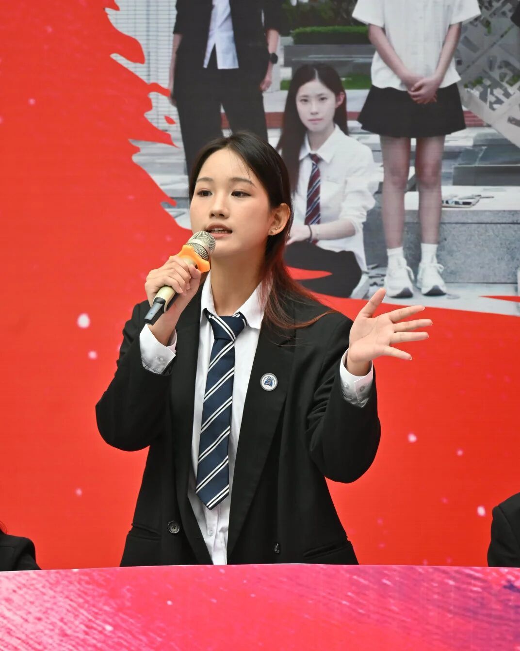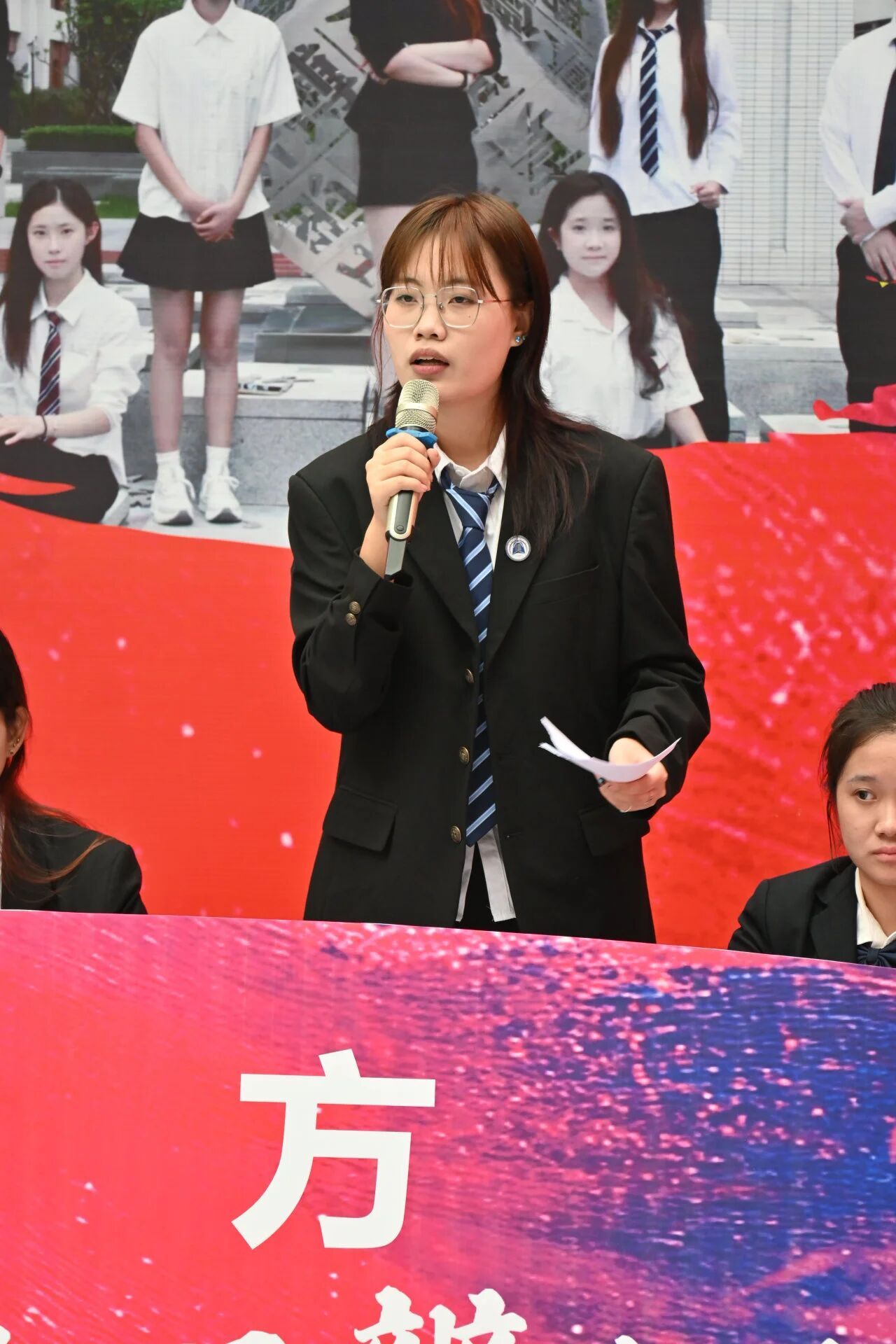 随后,我方四辩进行总结陈词,条理清晰地梳理整场辩论脉络,精准指出对方过度否定“硬核警示”价值、夸大“玩梗解构”作用的关键性逻辑谬误,强调法律作为社会准则的严肃性,明确娱乐化传播不应消解其本质权威,深化了普法宣传的核心主题。话音落下,台下立即响起雷鸣般的掌声。