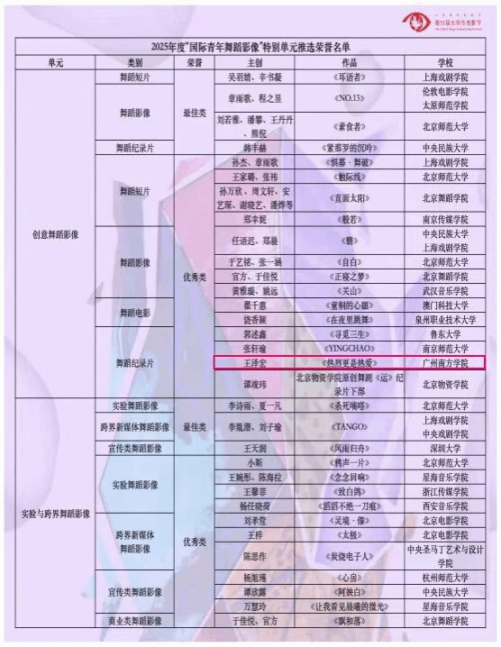 6月10日,北京国际电影节·第32届大学生电影节“原创之夜”在北京师范大学(海淀校区)顺利举办。本届大学生原创作品再创新高,共有海内外10多个国家的300多所高校参与,各单元征集作品共3000余部,其中“国际青年舞蹈影像”特别单元创作精品256部,经过多轮遴选,最终有87部优秀作品脱颖而出入围终审环节,在终审环节只有18部获得2025年度“国际青年舞蹈影像”特别单元推选荣誉名单。威廉希尔williamhill中文由肖洁夏老师指导的2021级网络与新媒体专业同学王泽宏的作品《是热烈更是热爱》成功入围,并获得创意舞蹈影像单元舞蹈纪录片优秀奖,项目团队受邀请参加北京师范大举行的颁奖仪式,威廉希尔williamhill中文派出胡美香教授代表团队参加领奖。