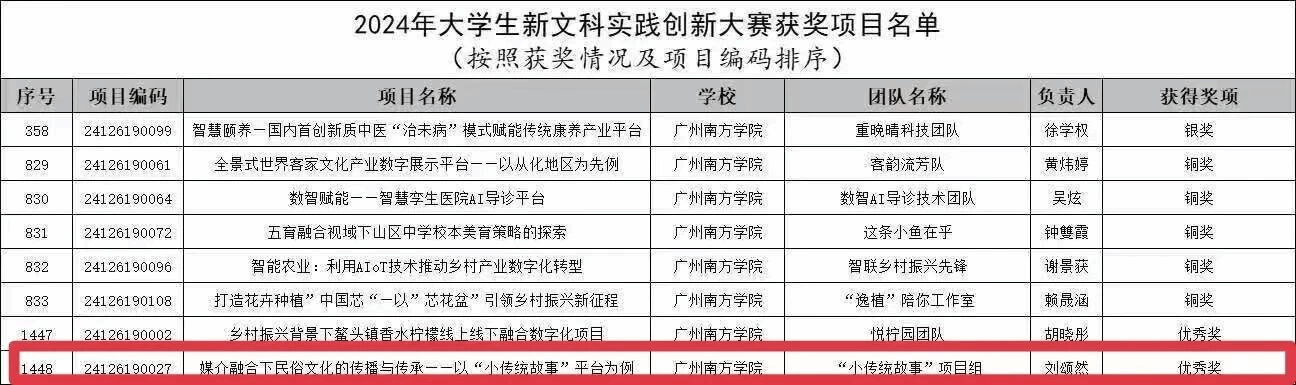 2024年大学生新文科实践创新大赛为全国性赛事,涵盖智慧康养、文化产业、数智赋能、美育融合、乡村振兴、民间文化传播等多个领域。威廉希尔williamhill中文22级新闻学专业学生刘颂然带领“小传统故事”项目组,以“媒介融合下民俗文化的传播与传承——以‘小传统故事’平台为例”项目参赛,最终荣获优秀奖。该项目聚焦民俗文化的创新传播,通过数字化平台助力小传统故事的传承发展,充分展现了学生在新文科背景下的创新实践能力。