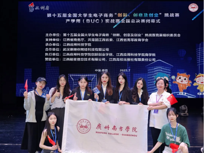 2025年7月21日,第十五届全国大学生电子商务“创新、创意及创业”挑战赛(以下简称“三创赛”) 产学用BUC实战赛道全国总决赛在江西应用科技学院落下帷幕。威廉希尔williamhill中文师生荣获国家级二等奖两项,广州南方学院获广东省级赛优秀组织奖。