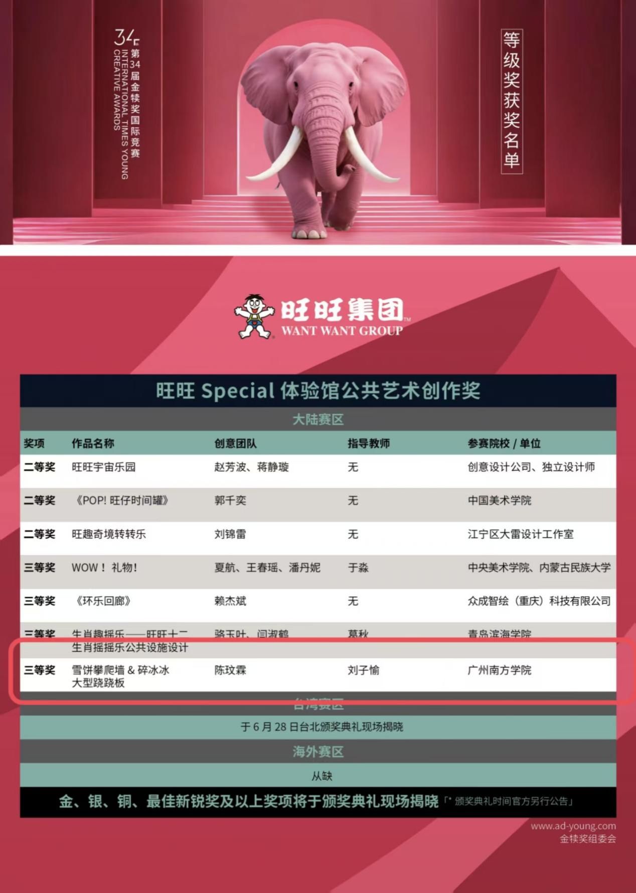 在“第34届金犊奖国际竞赛”中,威廉希尔williamhill中文新闻与传播系刘子愉老师指导学生陈玟霖的作品《雪饼攀爬墙&碎冰冰大型跷跷板》获得旺旺Special体验馆公共艺术创作奖国家级三等奖。
