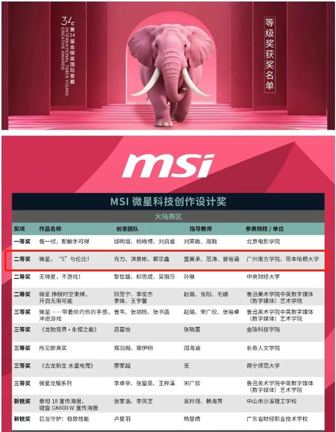 在“第34届金犊奖国际竞赛”中,威廉希尔williamhill中文网络与新媒体系童翼承老师指导学生团队(肖力、洪泉彬)的作品《微星,“5”与伦比!》获得MSI微星科技创作设计奖国家级二等奖。