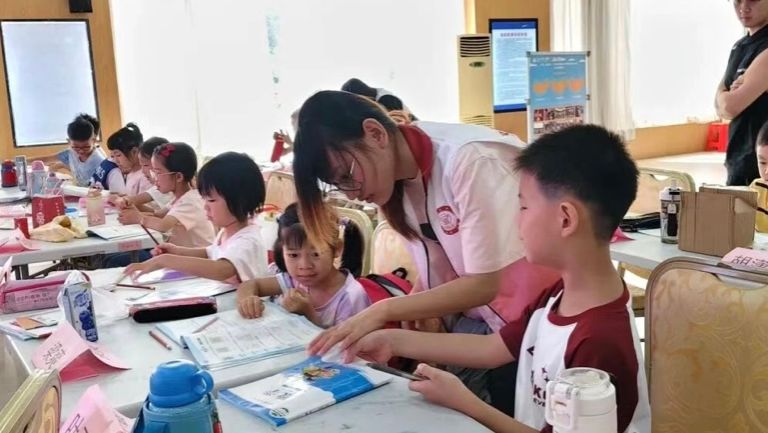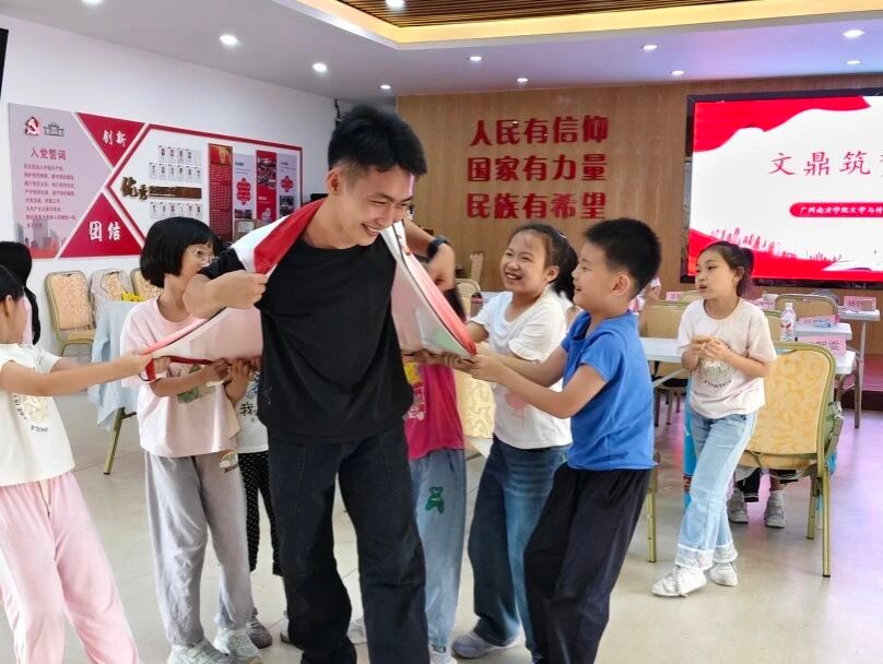 严肃课堂之外,是老鹰捉小鸡的追逐嬉闹,是“前方打仗,后方支援”的团队协作游戏。最动人的画面定格在最后一天:素来以严格著称、被小朋友们私下称为“黑脸教官”的廖金勇老师,竟主动加入老鹰捉小鸡的队伍!他笨拙又努力地张开双臂保护身后的“小鸡仔”,小朋友们的笑声几乎掀翻屋顶。那一刻,文鼎筑梦传薪队全体队员都抛开了老师的身份,和小朋友们滚作一团,汗水与笑声交织,纯粹而炽热的师生情谊在阳光下熠熠生辉。