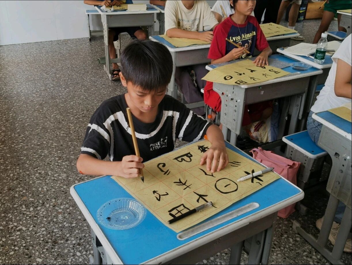 学生正进行甲骨文毛笔书法实践操作
