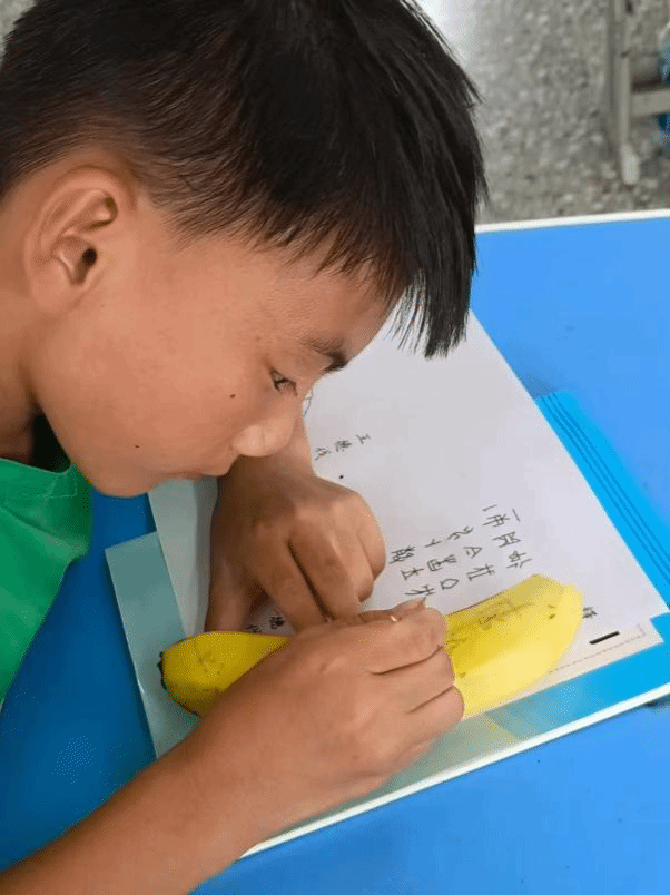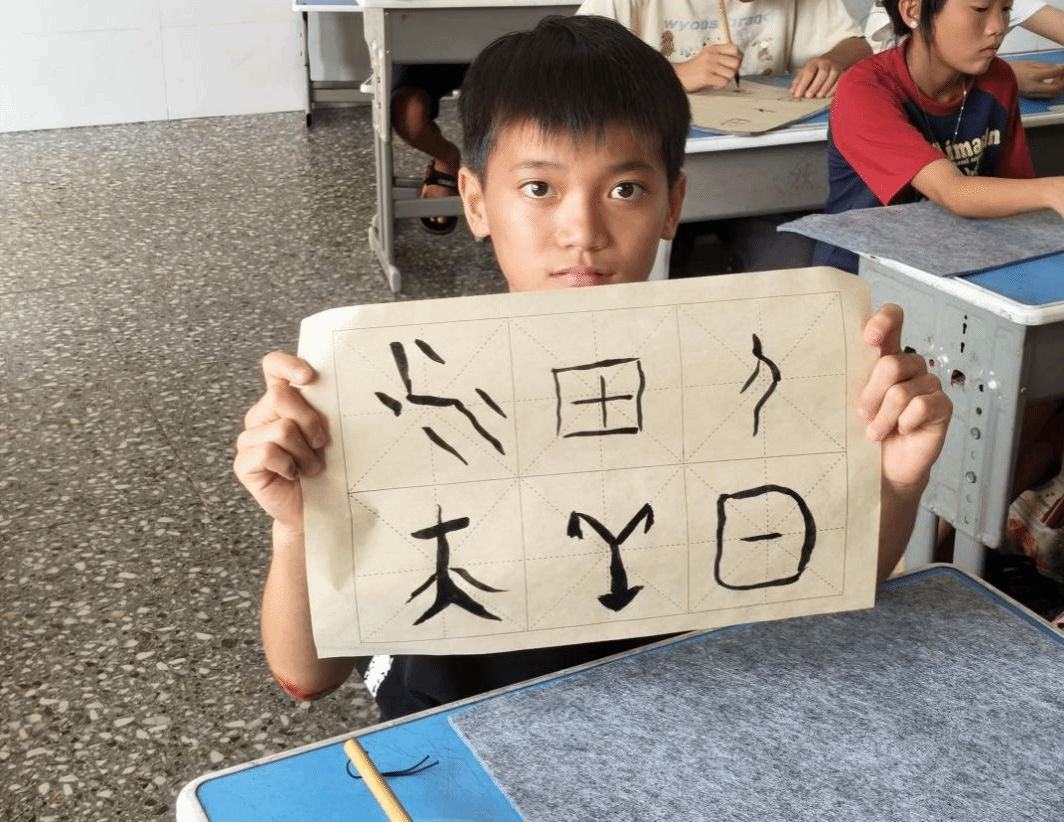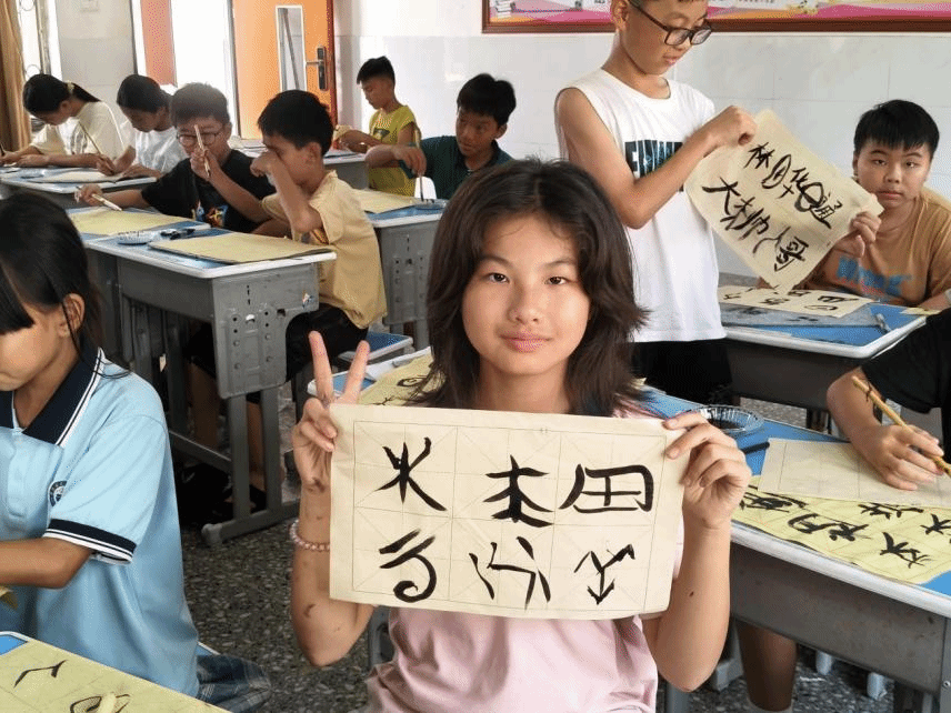 实践环节,李嘉玲教员在开设的甲骨文绘画课中,将学生喜爱的绘画与甲骨文相结合,激发学习热情。周泽漫教员在书法课程中融入甲骨文毛笔书法,借助AI模拟甲骨文拓片动态演示,助力学生掌握规范书写技巧,在笔墨间感受汉字文化魅力,提升书法素养与文化自信。宋明洋教员则开展甲骨文创意手工课,将甲骨文与香蕉皮、竹简相联动,通过趣味手工增强学生对甲骨文字的具身体验,在实践中涵养古文字素养,在欢乐中传承中华优秀传统文化。
