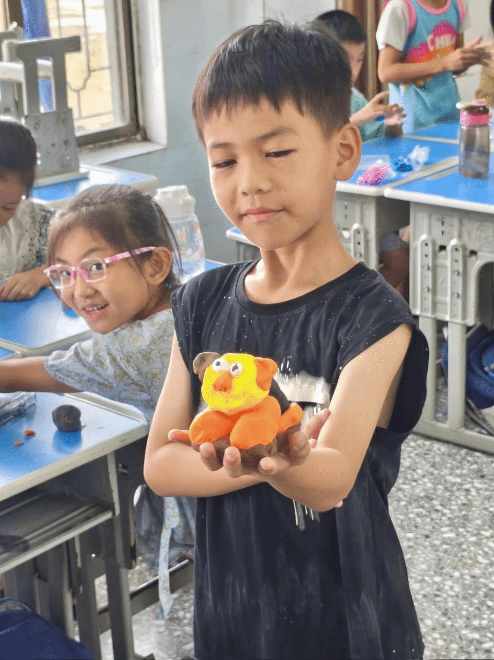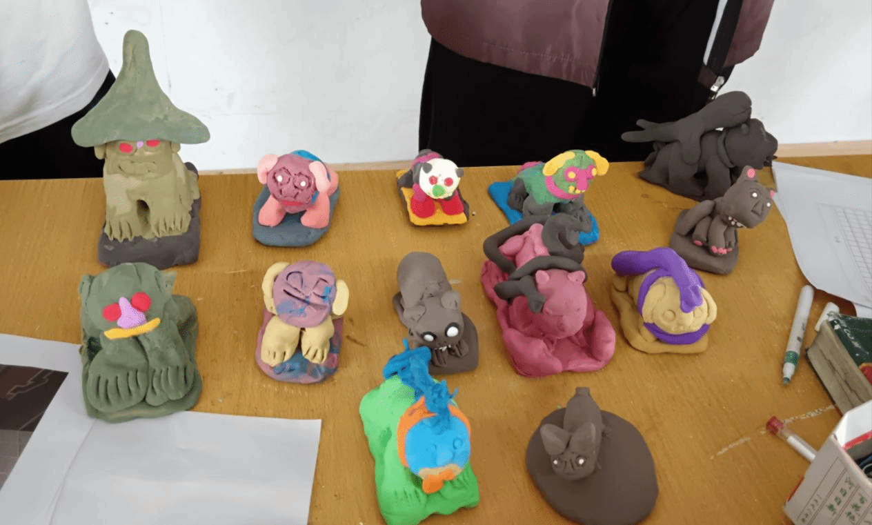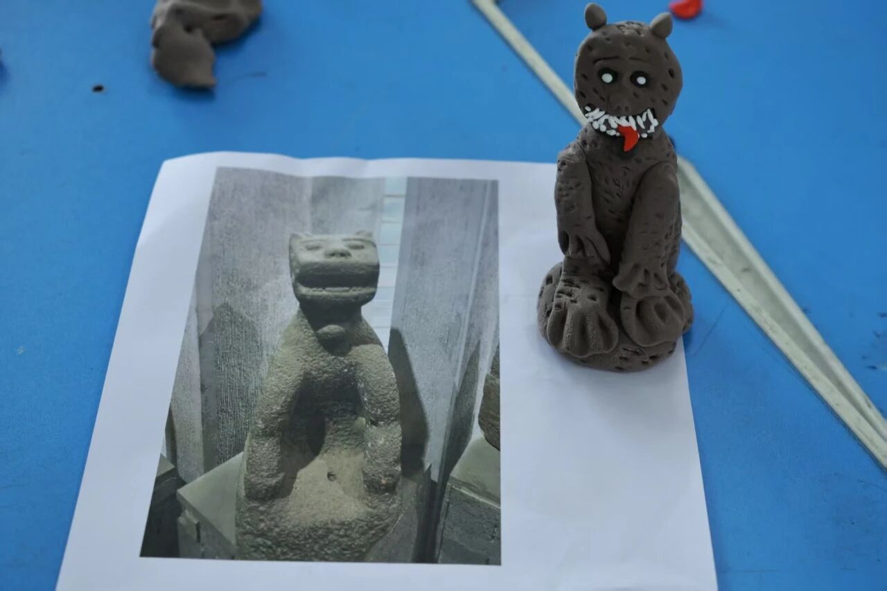 潘小曼教员在非遗课堂教学中,除了详细讲解雷州石狗的发展历史,还通过图片展示了各具特色的石狗造型,并借助AI技术让静态石狗“动”起来,让学生感受AI赋能下的雷州非遗文化特色。为使学生了解雷州石狗雕塑制作工艺,教员以小组为单位,引导学生充分发挥想象力与团队协作能力,用彩色橡皮泥捏制各具特色的石狗作品,让他们在动手实践中感受雷州非遗文化魅力,推动雷州石狗文化的传承与发展。