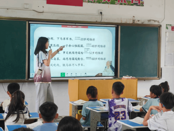 欧贵莹教员的古诗课堂突破传统背诵模式,以“沉浸式体验+深度理解”为核心,引领学生感受古典诗词的魅力。教学中,她结合诗词创作背景,借助AI进行故事讲述、图像展演,丰富古诗词教学形式;在诗句讲解中融入人文地理知识,鼓励学生结合自身经历解读诗词,拓宽学习的知识域与画面感。此外,她以“花”为切入点,引导学生回忆学过的古诗,实现温故知新。