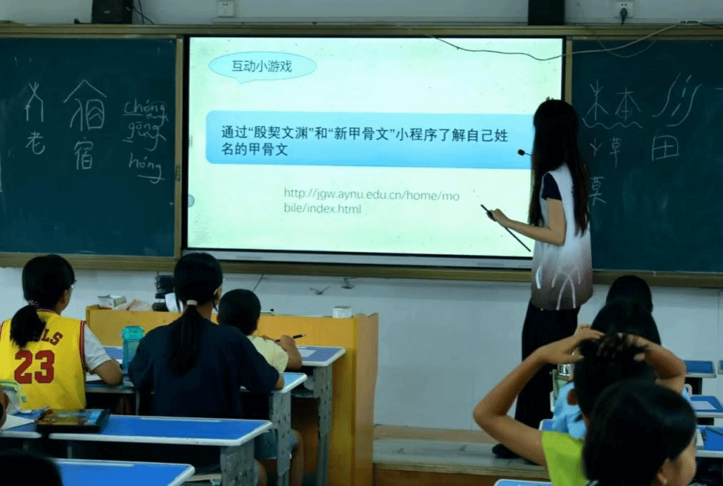 教员陈怡芳正在结合甲骨文版本的《西游记》给三年级学生上甲骨文趣味课堂