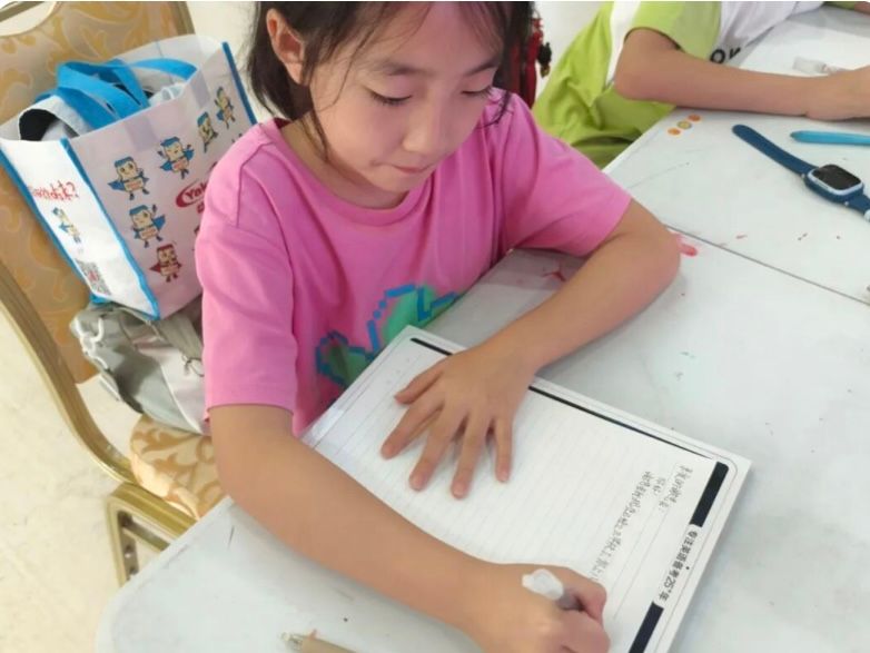下午第一节课——书法课程在王文舒老师的带领下徐徐展开。课程伊始,王文舒老师从最基础的书法书写坐姿入手,引导小朋友们在进行书法书写时始终保持端正的坐姿。王文舒老师耐心细致地讲解横竖撇捺的书写要领,小朋友们则眼睛盯着屏幕,手中的笔随着老师的示范在空中比划着。随后,王文舒老师引入红色革命诗,带领小朋友们朗诵,让他们感受诗歌的韵律与情感。接着,小朋友们在洁白的纸张上,用刚刚学到的知识,一笔一划认真地书写着革命诗。当一幅幅作品完成时,小朋友们的脸上洋溢着自豪的笑容。这些作品不仅是书法艺术的展现,更是红色精神在小朋友心中留下的生动印记。