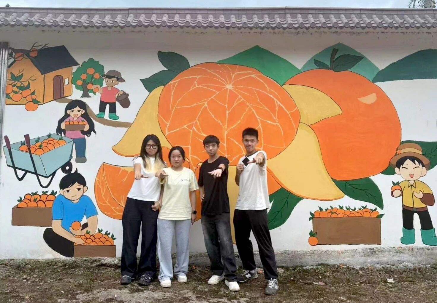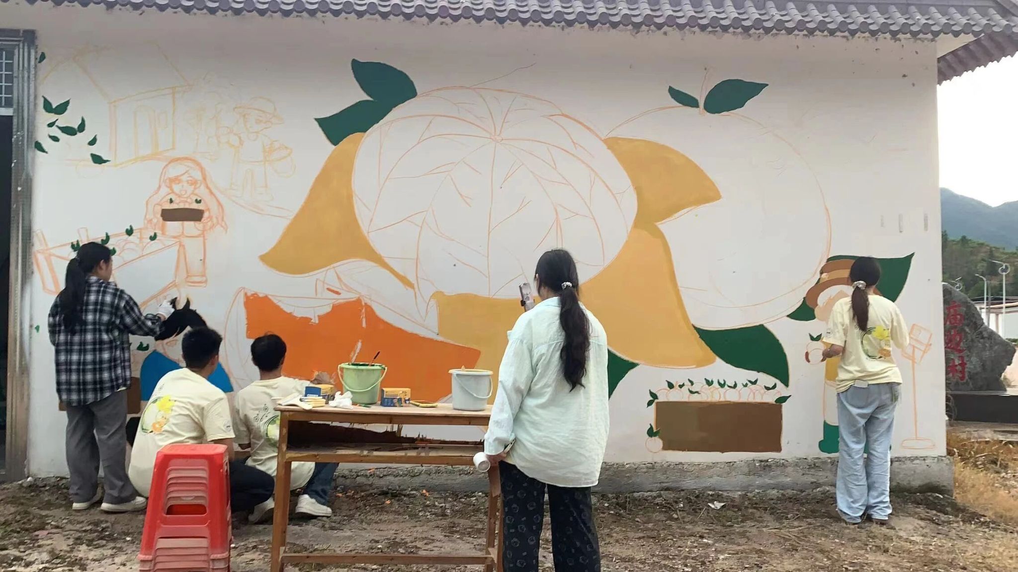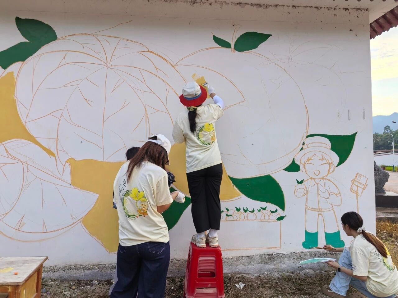 本次三乡下结对的第四个项目为“绘彩乡韵,植绿家园”,我们经过走访调研、村委交流,了解到何皮村的特色农产品有砂糖橘、早脆梨、三华李等,以此为主题创作了三幅墙绘,分别是:砂糖橘丰收之时、梨花盛开之时和乡村振兴手印共创之树。