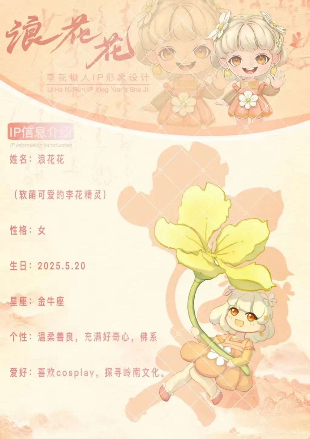 每年1~2月,杨梅镇千亩李花盛开,漫山遍野李花开,吸引了不少游客前来打卡拍照。因此,团队将“李花”作为核心设计理念,辅以猴桃、砂糖橘等杨梅镇特色元素,设计名为“浪花花”的IP形象。浪花花既代表杨梅镇的特色景观,也代表本实践团队与杨梅镇村民们携手共创乡村新田园。并且,在浪花花的参与下我们开启了助农直播。