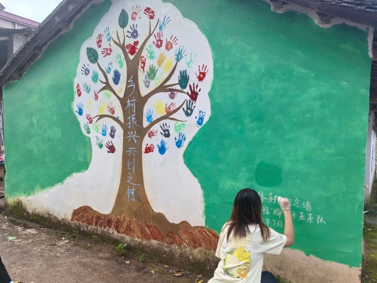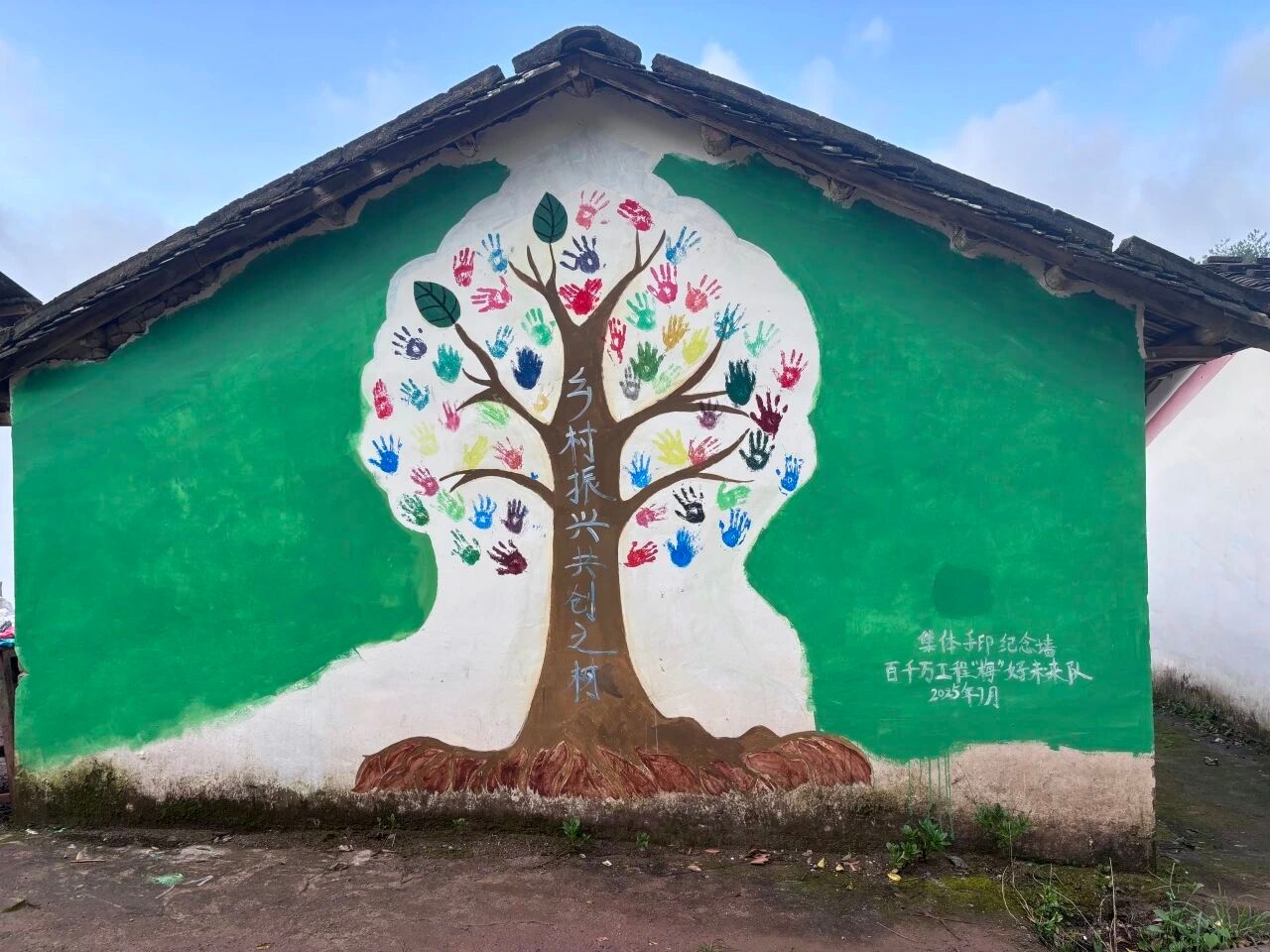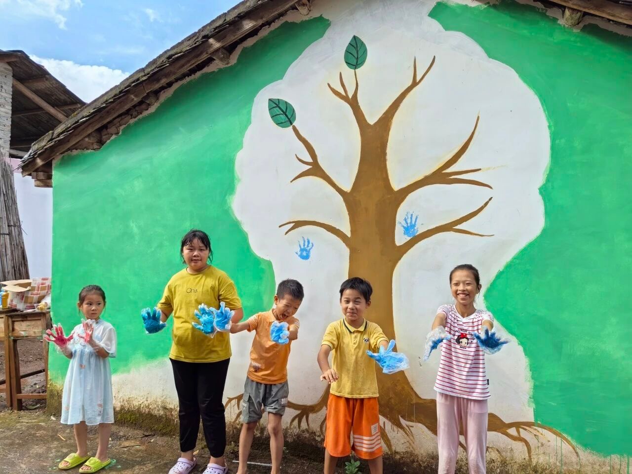 第三幅画作是“共绘成长之树”,通过集体手印创作象征着乡村振兴同心圆:每个手印都是参与者对美丽乡村建设的承诺,汇聚成蓬勃发展的生命之树。同时,孩童的手印如新芽,团队参与架枝干,生动诠释"立德树人"与"人才下乡"的融合。这样的共创既保留童趣又凸显新时代乡村建设的集体智慧。