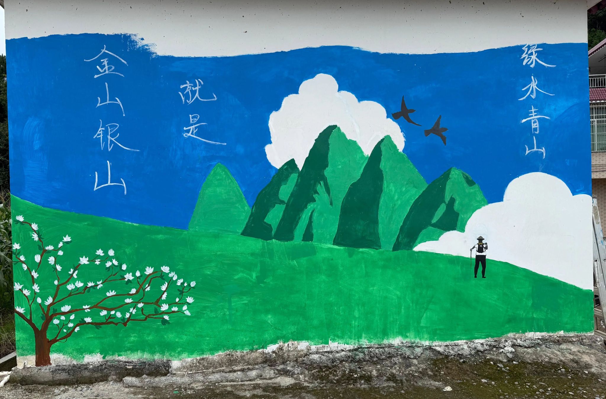 第二幅作品"梨花盛开的时节"将杨梅镇早脆梨花朵盛放的美景再现于墙面。画面通过"金山银山"与"绿水青山"的并置,展现了农村可持续发展的路径。