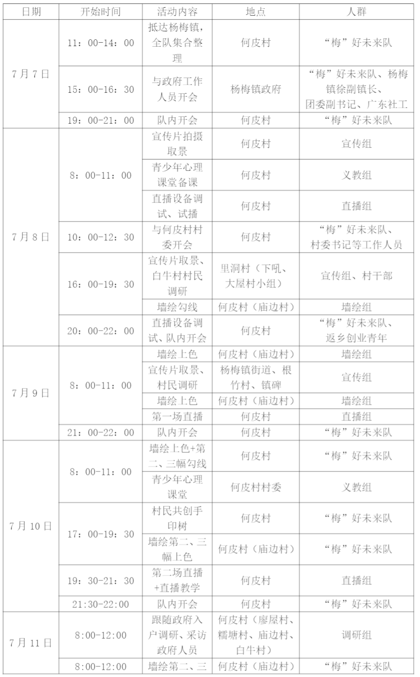 在2025年夏季,广州南方学院“梅”好未来队以饱满的热情和双倍的活力,深入清远市杨梅镇的自然景观之中。2025年7月7日-7月12日,在为期六天的活动中,队员们承担了多重角色,包括助农直播者、心理宣传者、墙绘创作者以及视频宣传者,有效地为传统的“三下乡”活动注入了新的活力和创新元素。